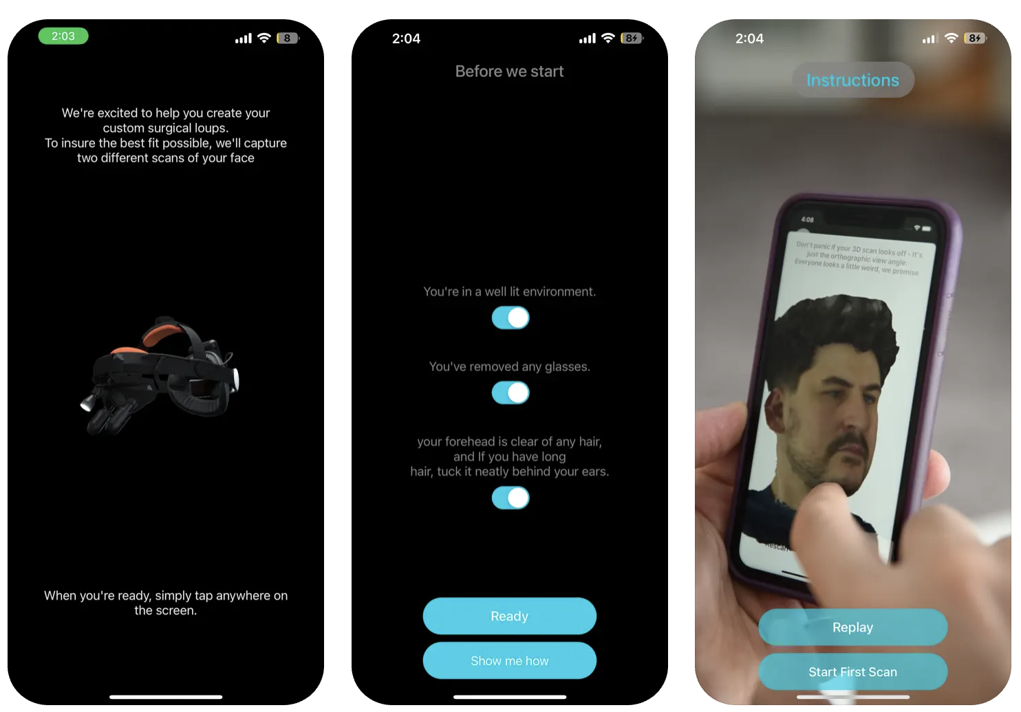 With just a few simple steps, medical professionals can scan their face using the app, creating a high-precision digital model. This data is then used by manufacturers to craft tailor-made loupe frames that ensure optimal comfort, perfect fit, and superior performance — all critical during extended surgical operations.